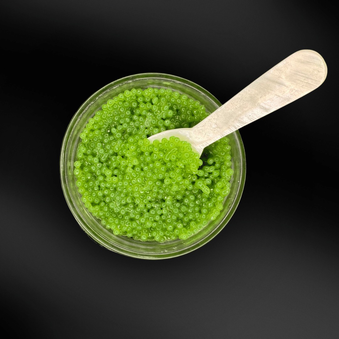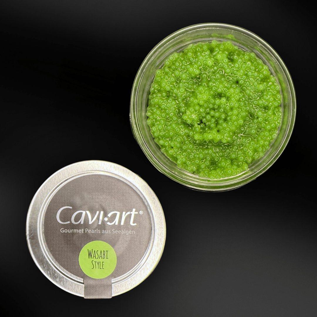 Genießen Sie eine geschmackvolle, vegane Alternative zu herkömmlichem Kaviar. Die intensiv grünen Perlen beeindrucken durch ihre knackige Konsistenz und den authentischen, leicht scharfen Wasabi-Geschmack.